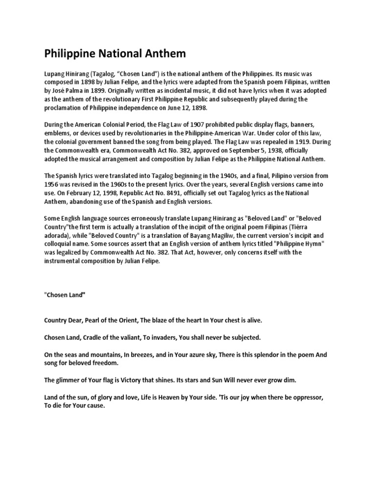Lupang Hinirang Wikipedia Lyrics to 'lupang hinirang' by lupang hinirang: